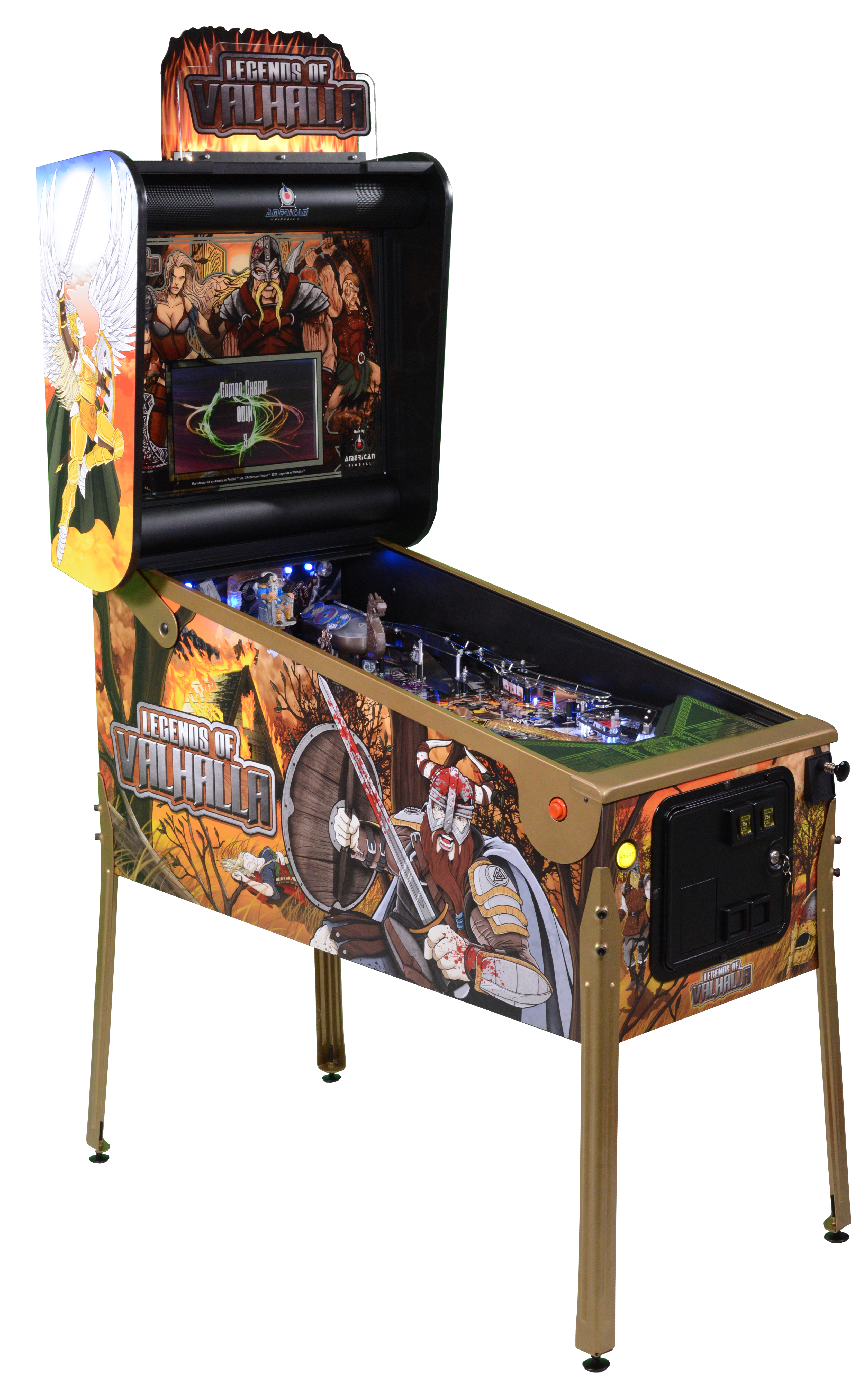 Legends of Valhalla, designed by Riot Pinball, is the 4th American Pinball title. Legends of Valhalla is an immersive pinball machine which brings the player into the world of the Norse gods and other Viking mythology. The game is a standard body design, utilizing three flippers offering a variety of fast and unique shots, including 3 metal ramps. The game rules have a variety of objectives that the player must either start or complete as they work their way through the game attempting to not only reach the wizard mode Valhalla, the majestic hall of dead Vikings, but also advance to the final epic battle known as Ragnarok, the super wizard mode.