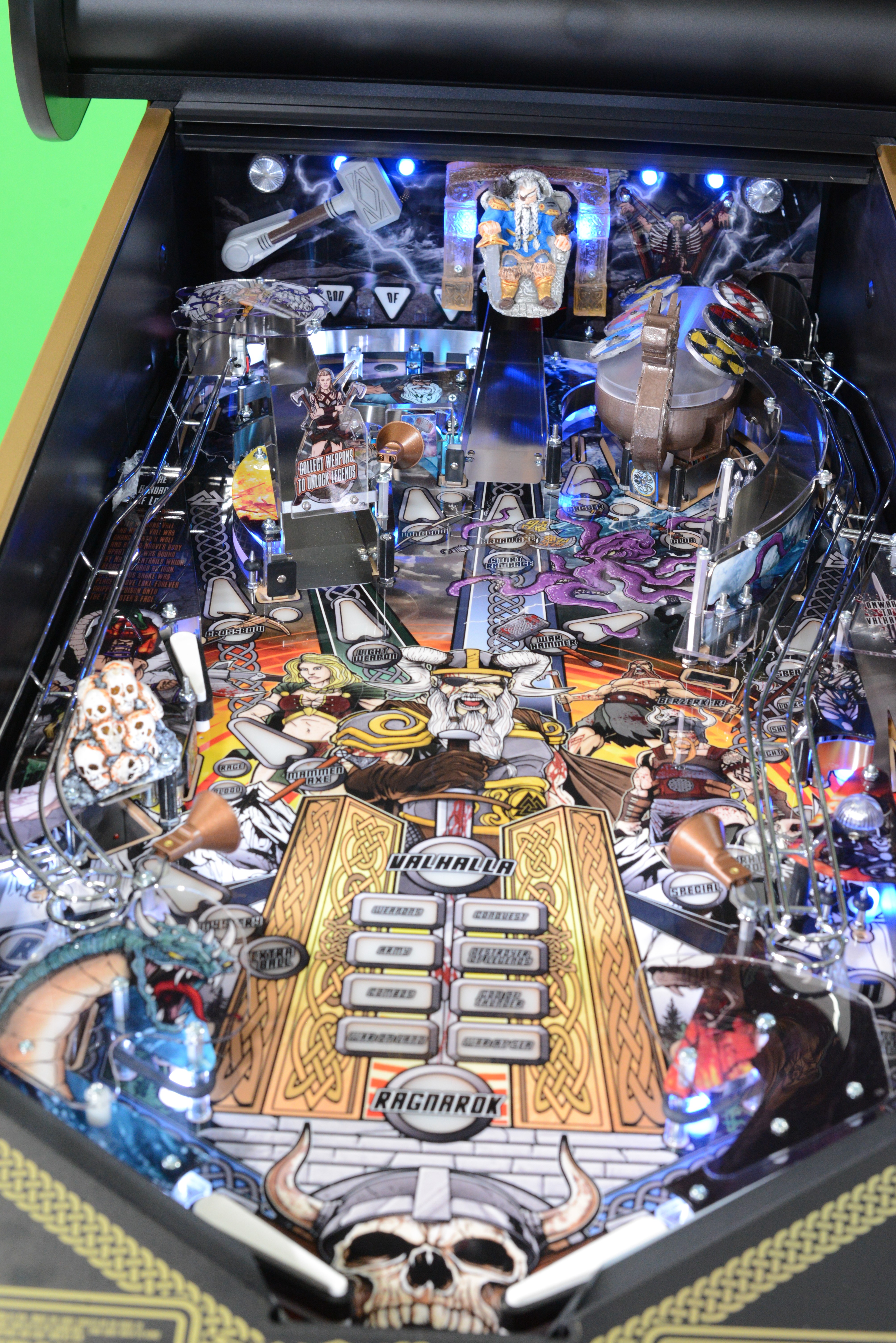 The game also exhibits a couple of fun playfield features such as the Kraken, which grabs the ball via a hidden magnet mounted underneath the playfield and flings it around in chaos. Also featured is a Viking ship where the player builds their army by locking balls inside to begin multiball play. Additionally, Thor's hammer, which is mounted on the back panel and activated by a 3rd flipper button, comes crashing down onto the ball which is held by a magnet just over the top lanes, simulating a dramatic lightning strike, adding to the gameplay experience.